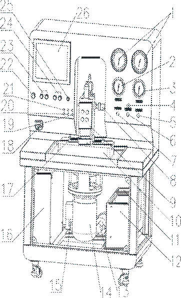 5、把供油管插入到調(diào)速器加油口內(nèi),啟動供油泵組,給調(diào)速器加注測試油,看調(diào)速器油標(biāo),加到合適的位置即可,然后按下停止按鈕;