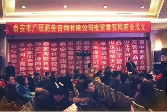 2015年1月26日,泰安市網(wǎng)商協(xié)會(huì)成立大會(huì)在泰安寶龍福朋酒店隆重舉行。參會(huì)的有泰安市政府領(lǐng)導(dǎo)、泰山區(qū)區(qū)委書(shū)記和阿里巴巴北方區(qū)域、泰安市商務(wù)局、泰山區(qū)商務(wù)局、市建行、泰山學(xué)院、山東科技大學(xué)、市外網(wǎng)商會(huì)等多家單位的主要領(lǐng)導(dǎo)以及泰安網(wǎng)商會(huì)全體會(huì)員。